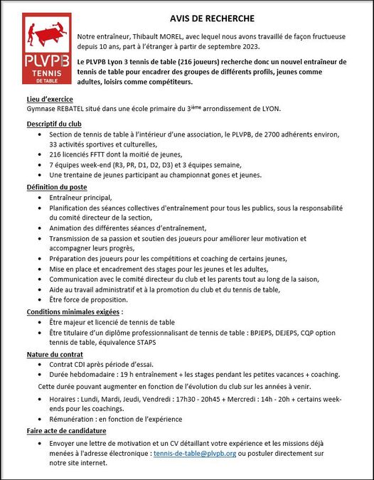Nous recherchons une personne passionnée et compétente pour aider notre club à progresser. Si vous êtes prêt(e) à relever ce défi ou si vous connaissez quelqu’un qui serait un bon candidat, n’hésitez pas à nous contacter à l’adresse suivante tennis-de-table@plvpb.org, faire acte de candidature sur notre site internet ou passer à notre salle, 29 rue Rebatel, en soirée. Vous trouverez plus d’information dans la fiche de poste ci-dessous.